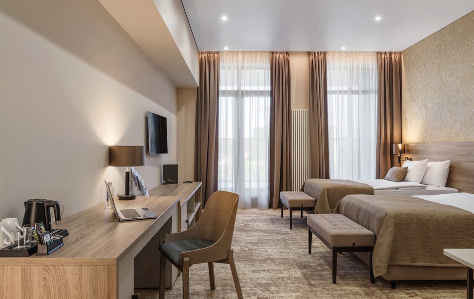 В номере: вешалка, зеркало, кресло, кровать двуспальная, прикроватные тумбочки, стол, тумба багажная, шкаф, мини-холодильник, сейф, телевизор ЖК, телефон, чайный набор посуды, электрочайник