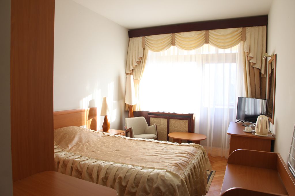 В номере: кровать одноместная, тумба прикроватная, шкаф, кресло, стол, спутниковое телевидение, кондиционер, холодильник, электрочайник