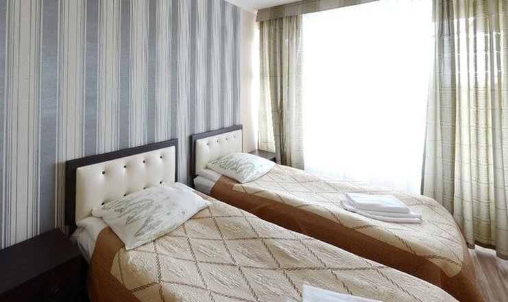 Оснащение номера: кровати односпальные, прикроватные тумбочки, стол, стулья, шкаф, телевизор, холодильник